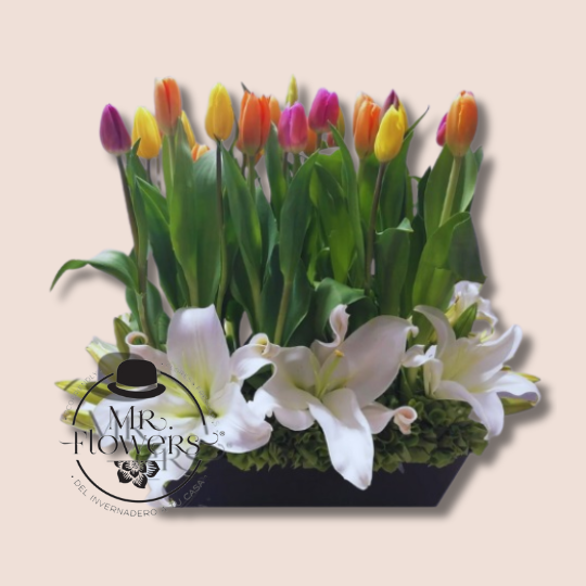 Hermoso arreglo floral con Tulipanes y Casa Blanca original y alegre, que te encantará por su belleza.