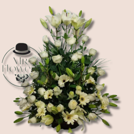Arreglo floral fúnebre elaborado con amor y respeto por nuestros experimentados diseñadores, utilizamos flores frescas recién cortadas con Calidad Premium. ¡Perfecto para el Último Adiós!