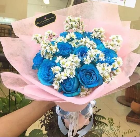 Disfruta Regalando un Hermoso Ramo con 13 Rosas Azules con Elegante Moño Satinado Doble Cara