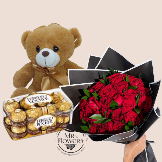 Disfruta regalando hermosas flores y arreglos deliciosos que alegrarán el día de cualquier persona. Un hermoso Ramo de Rosas con Chocolates Ferrero y un Peluche convertirá un día especial en un día espectacular.
